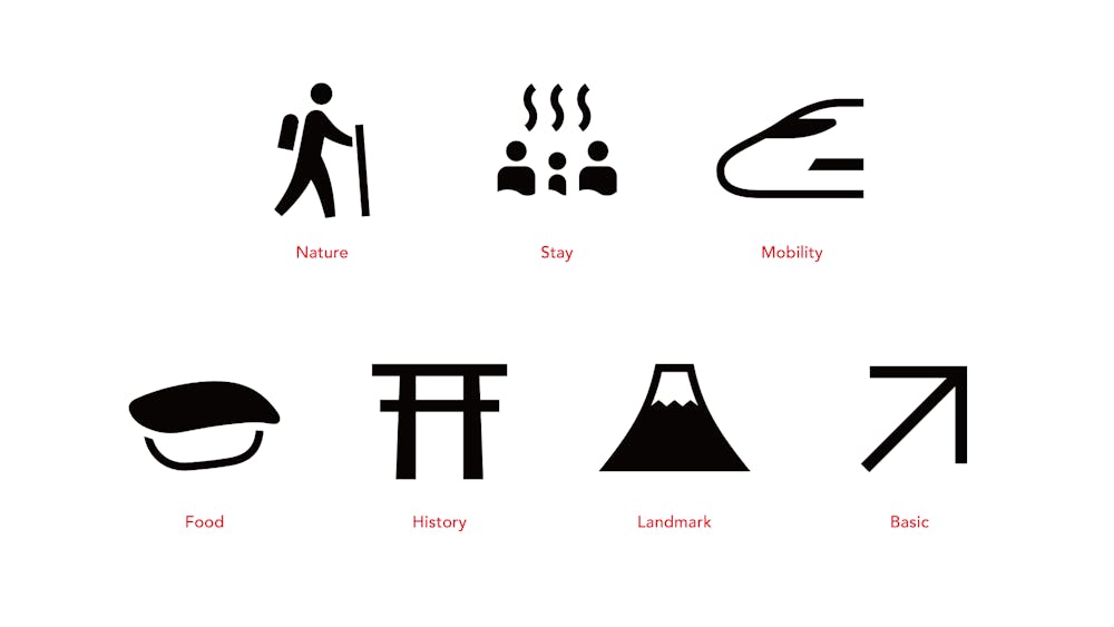 EXPERIENCE JAPAN PICTOGRAMSは、デザインの視座から、日本観光の魅力的な体験を支えるべく生まれた新機軸のピクトグラムです。シンプルでわかりやすい造形、そして「二度目の日本」をキーワードに、従来のピクトグラムよりも日本の体験を一歩深く掘り下げた独自性あるラインアップが特徴です。